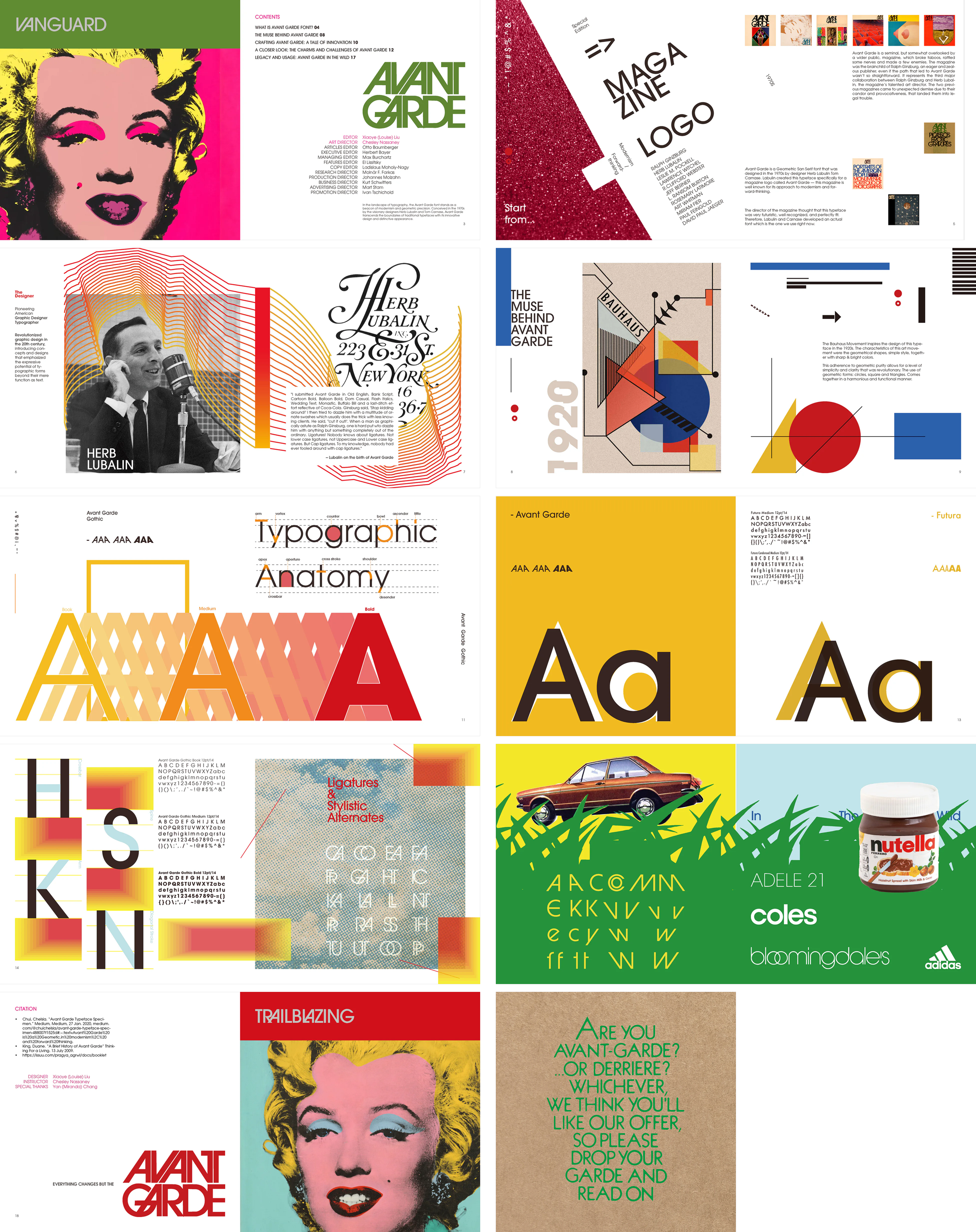 Typography Specimen Booklet for the typeface AvantGarde. The booklet features various assets inspired by the original Avant Garde Magazine and pays homage to the 70s style and pop art.